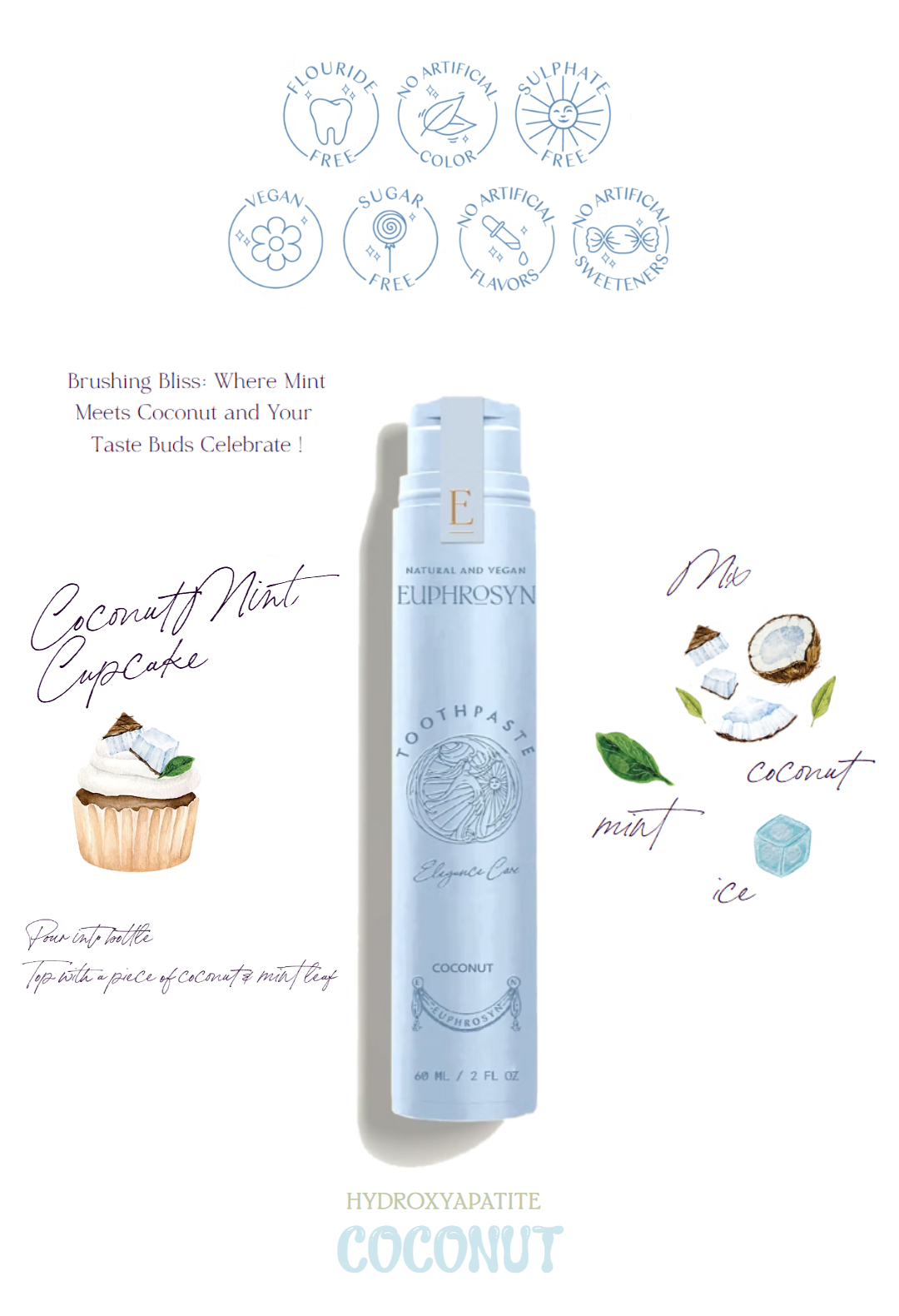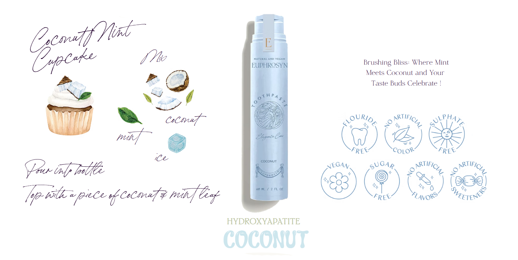 Purified Aqua, Calcium Carbonate, Silica (Friction Type) Glycerin, Hydroxyapatite, Hydrated Silica, Xylitol, Cocos Nucifera Fruit Extract, Xanthan Gum, Potassium Sorbate, Sodium Benzoate, Sodium Cocoyl Glutamate, Tocopheryl Acetate, Aloe Barbadensis Leaf Juice, Limonene, Potassium Gluconate