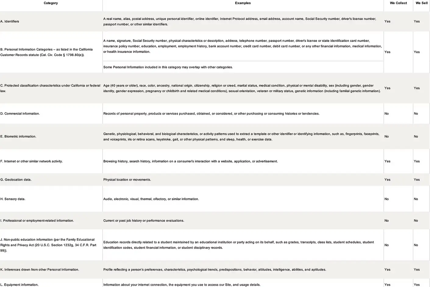 In particular, the Site has collected the following categories of Personal Information from its consumers within the last 12 months: