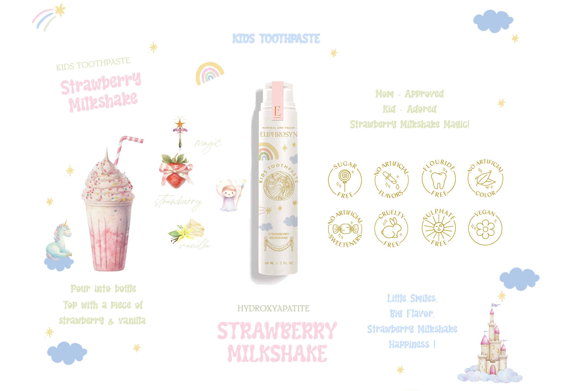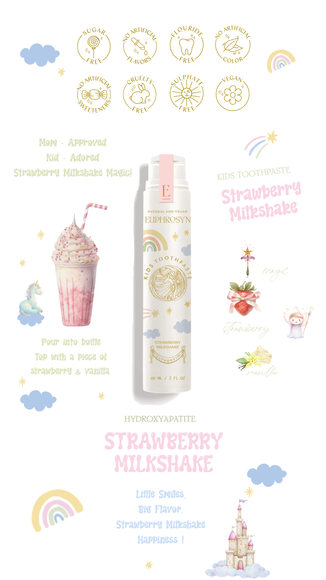 Purified Aqua, Calcium Carbonate, Silica (Friction Type), Glycerin, Hydroxyapatite, Hydrated Silica, Xylitol, Xanthan Gum, Potassium Sorbate, Sodium Benzoate, Sodium Cocoyl Glutamate, Fragaria Vesca Fruit Extract, Vanilla Planifolia Fruit Extract, Tocopheryl Acetate, Aloe Barbadensis Leaf Juice, Limonene, Potassium Gluconate